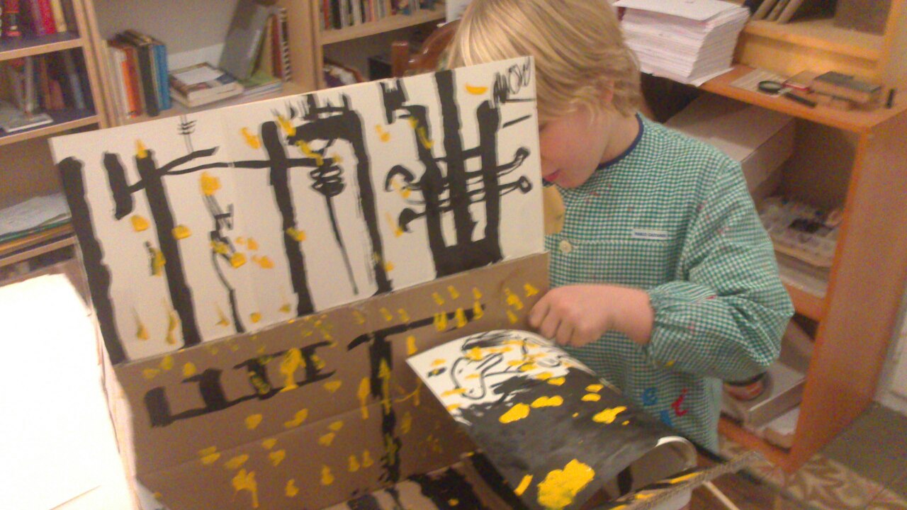 De golpe, en apenas un minuto y de la mano de un niño de 8 años, por gracia del simple gesto de pintar, extender pintura sobre una superficie, este rectángulo de plástico se acercaba más al origen físico, o sea al árbol, a la sensación orgánica y se alejaba en nuestras mentes del objeto producido industrialmente, en repetición.